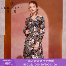MORELINE沐兰商场同款秋装中长女V领立裁收褶印花连衣裙