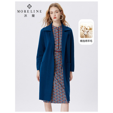 MORELINE沐兰冬季湖蓝色简约翻驳领羊毛大衣外套中长款